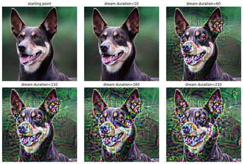 A simple photo of a dog, when processed through DeepDream, can be transformed into a kaleidoscopic vision where the dog’s features are duplicated and morphed into a fantastical array of eyes and shapes, creating a mesmerizing and unsettling image.